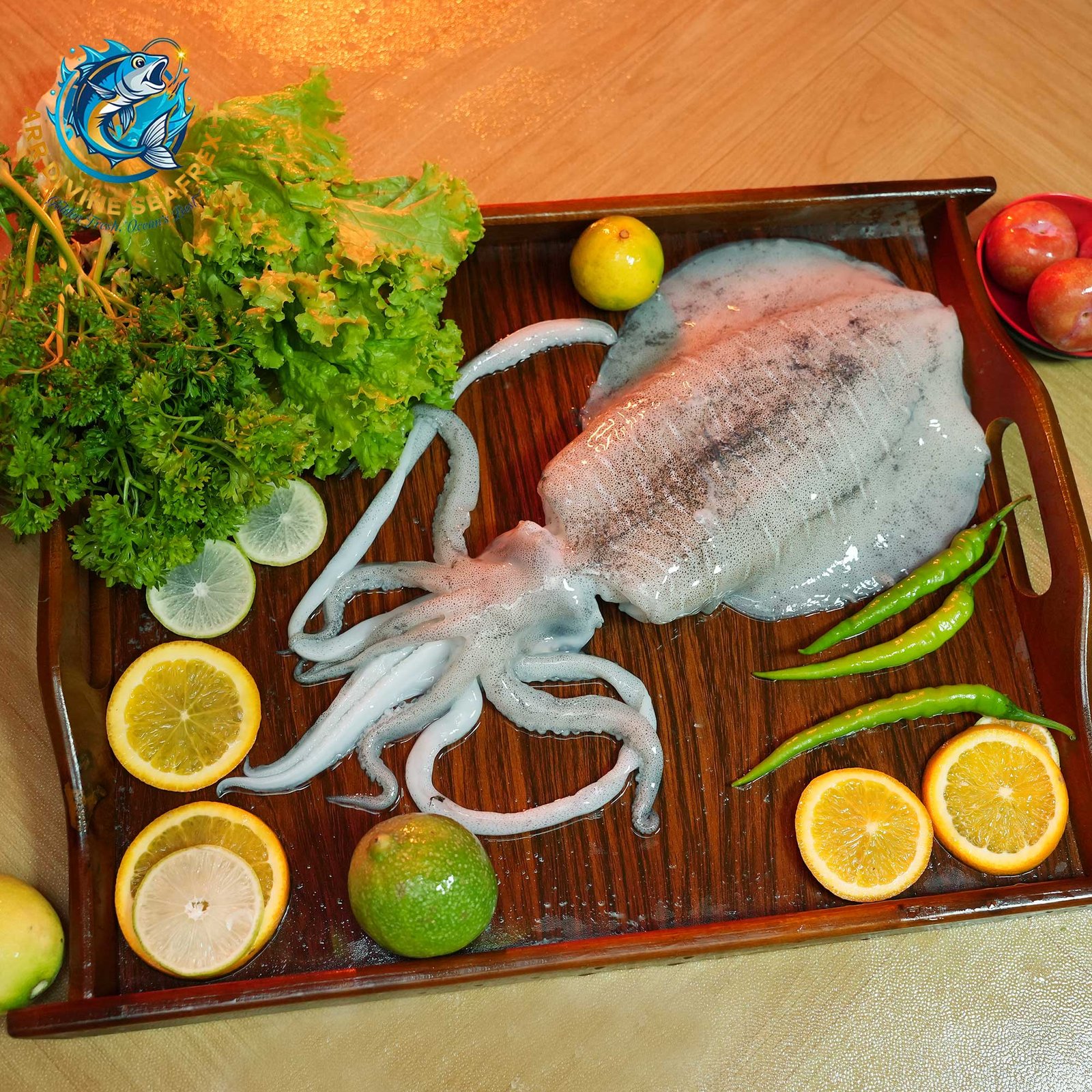 Quality & Appearance: The image features a large, whole, unprocessed squid, beautifully displaying its mantle and tentacles. The pristine white-to-light-grey skin and firm body indicate minimal handling and exceptional freshness. It is showcased on a wooden platter alongside fresh accompaniments—crisp lettuce, parsley, bright citrus (oranges and limes), and green chilies—emphasizing its natural affinity for fresh, zesty, and spicy flavour pairings.